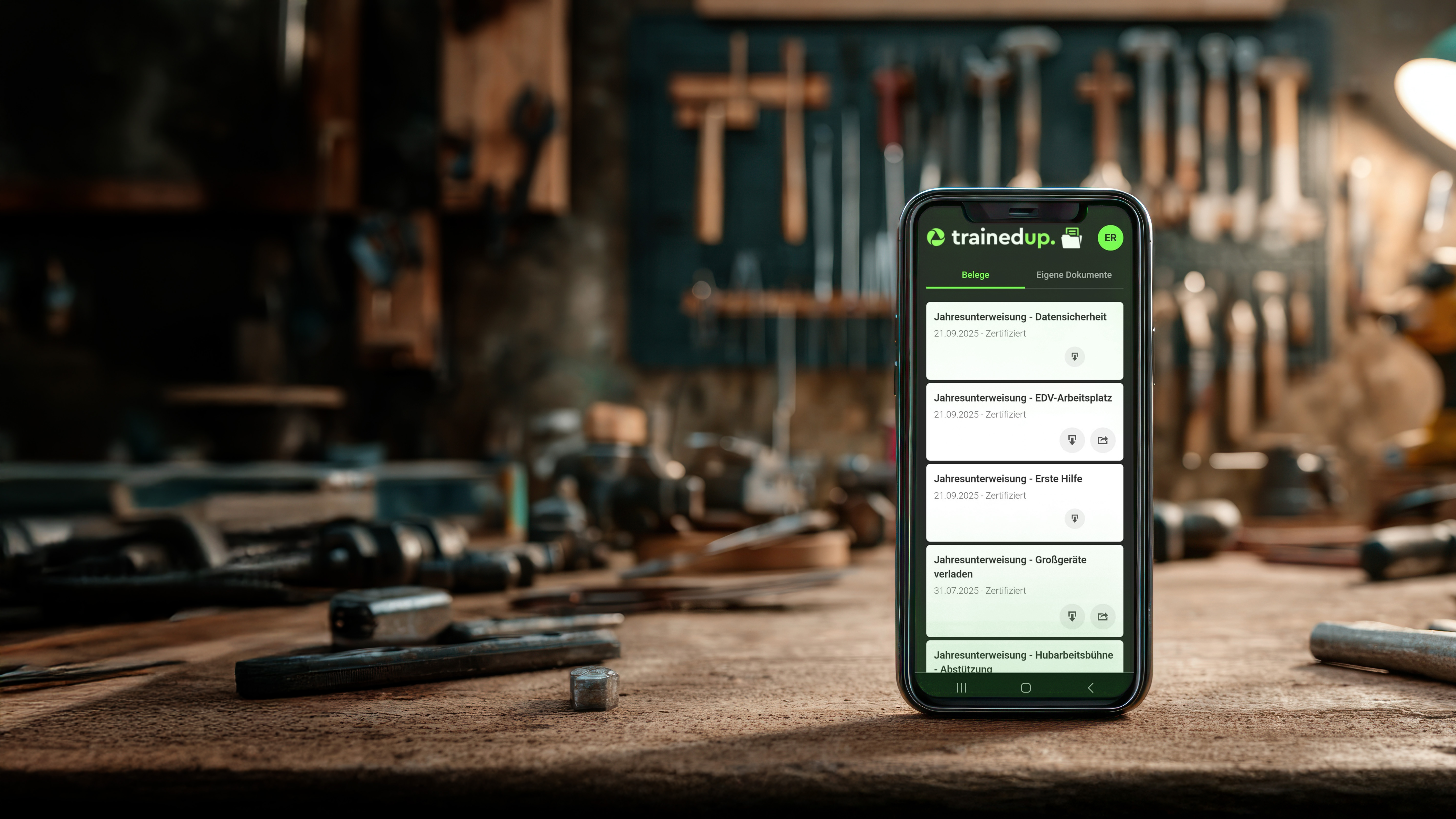 Schluss mit Papierordnern: trainedup organisiert Ihre Jahresunterweisungen zentral, erinnert automatisch an Fristen und speichert alle Nachweise im Wallet Ihrer Mitarbeitenden. Bei Bedarf sind die Zertifikate direkt per Smartphone vorzeigbar und sofort teilbar. Das persönliche Wallet macht jeden Nachweis jederzeit verfügbar – ohne Suchen, ohne Aufwand. Über das Dashboard behalten Sie als Unternehmen alle Jahresunterweisungen und Fristen im Blick. Mitarbeitende greifen flexibel von überall zu und haben ihre Dokumente stets griffbereit. So wird Arbeitsschutz einfach, digital und rechtssicher dokumentiert.